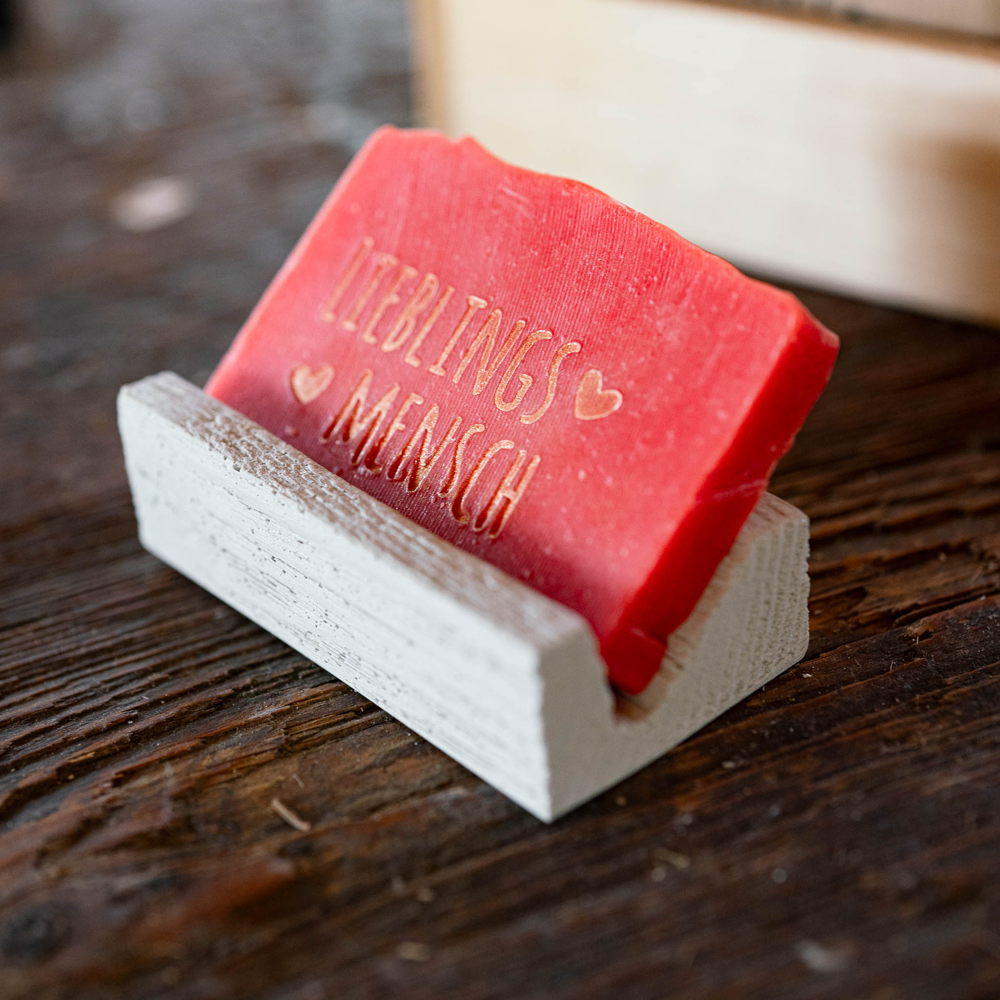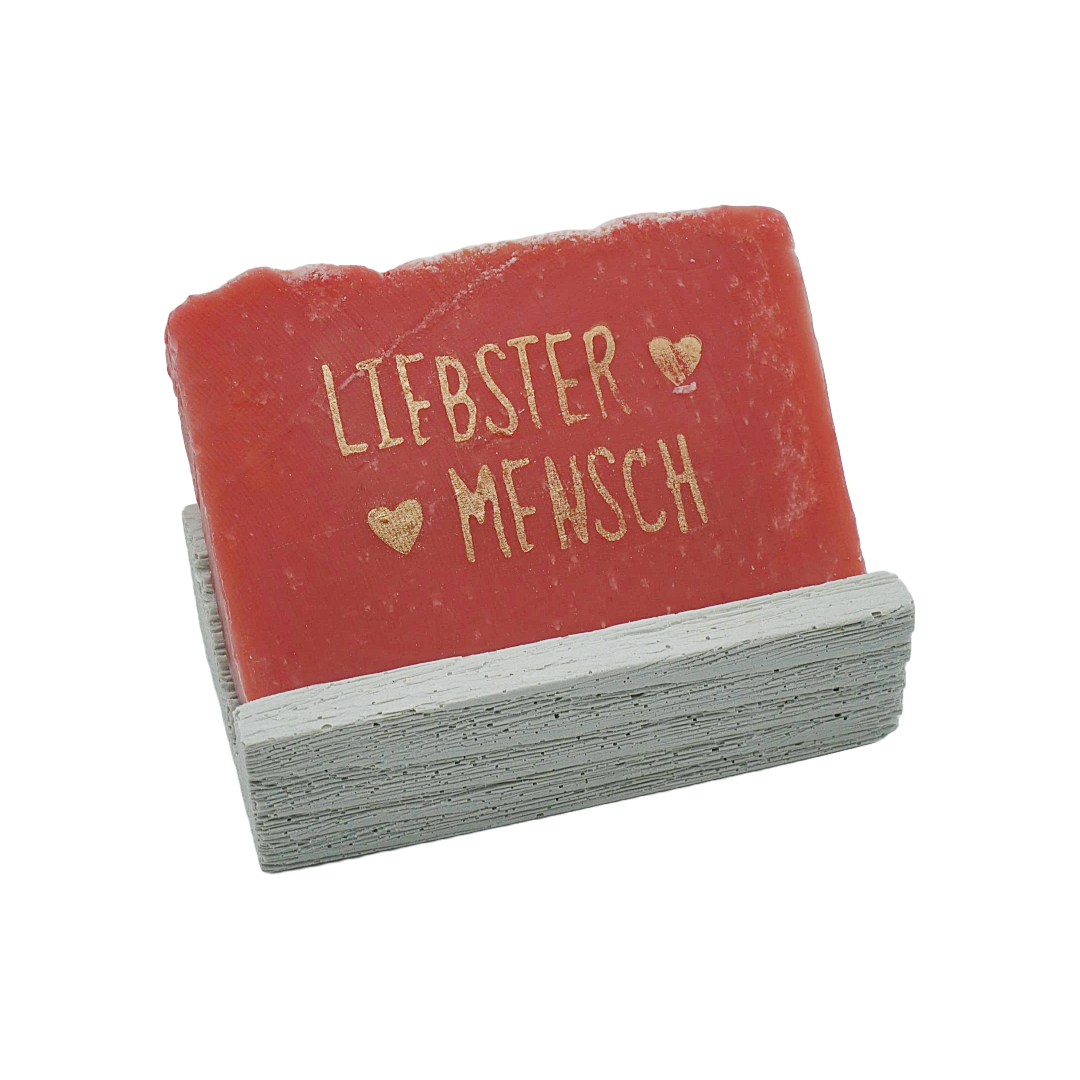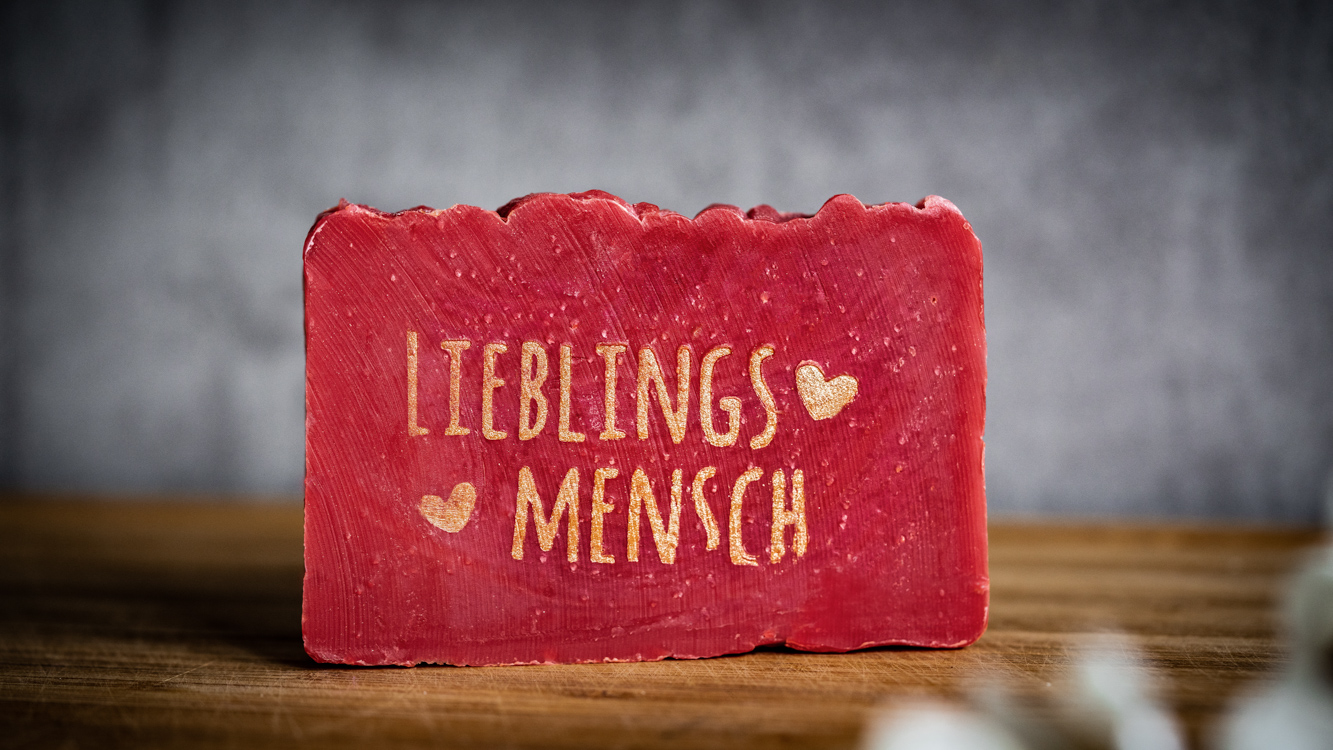 Unsere Seife zum Valentinstag duftet wunderbar nach Ribisel (Johannesbeeren) und ist mit einem goldenen Schriftzug “Lieblingsmensch” gestempelt. Mit besonders viel Liebe hergestellt, vermittelt diese kleine Liebesbotschaft deine Leidenschaft für den oder die Beschenkte(n) so gut wie sonst nix auf dieser Welt.
