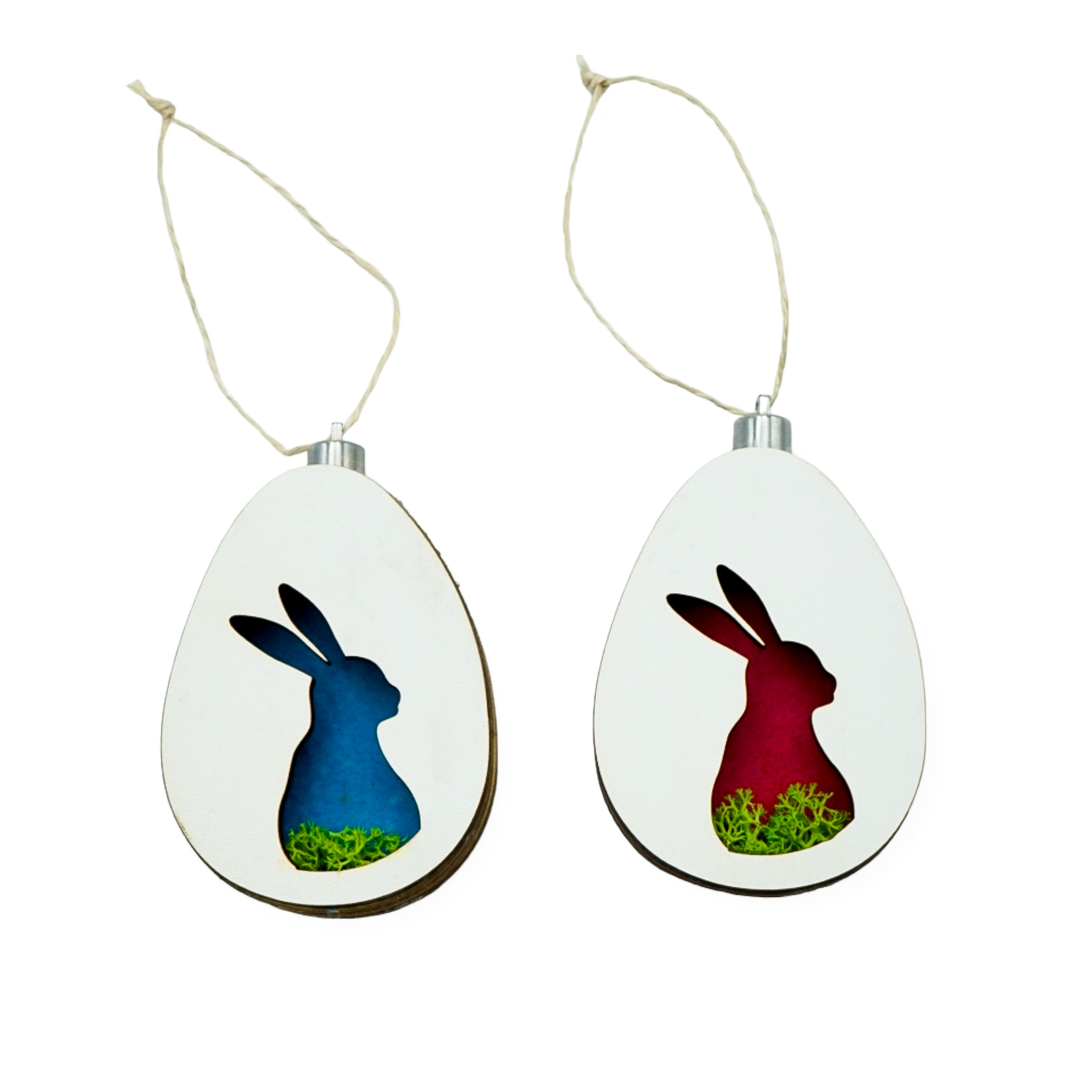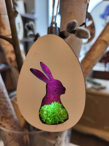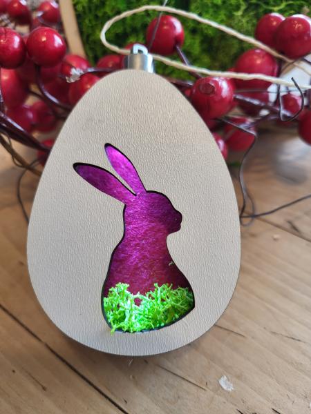 3D Osteranhänger aus Holz in Eierform mit Hase in 2 verschiedenen Farben aus Filz und Einer LED Lampe