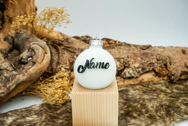 Diese Weihnachtsbaumkugel / Christbaumkugel wird mit einem ansprechenden, modernen Schriftzug aus weißen oder schwarzen Acryl personalisiert. Du kannst zwischen verschiedenen Farben bei den Kugeln wählen.