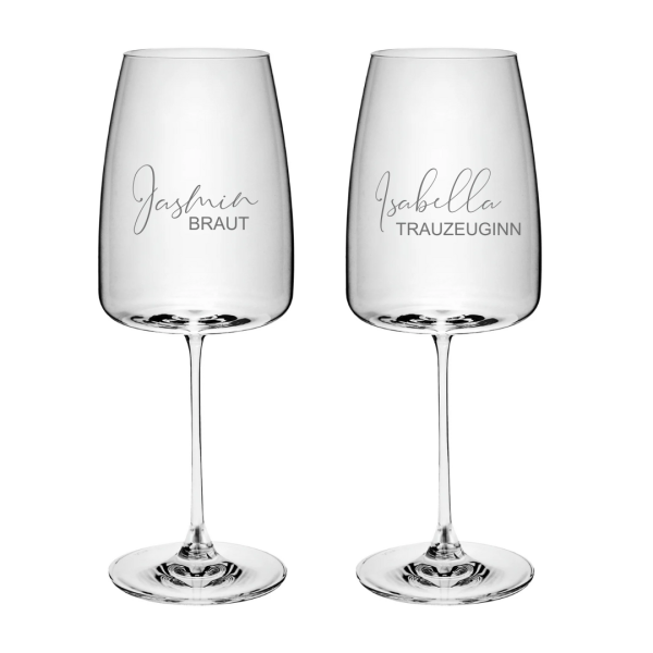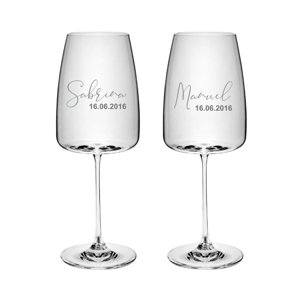 Unsere personalisierten Weingläser bieten eine Vielzahl von Gestaltungsmöglichkeiten. Ob "Mr. & Mrs. Meier", Namen mit Datum, Firmenlogo, Braut oder Trauzeugin, Einzelnamen oder Vereinslogo - deiner Kreativität sind keine Grenzen gesetzt! Jedes Glas wird nach deinen Wünschen individualisiert, um die Persönlichkeit des Beschenkten zu unterstreichen.