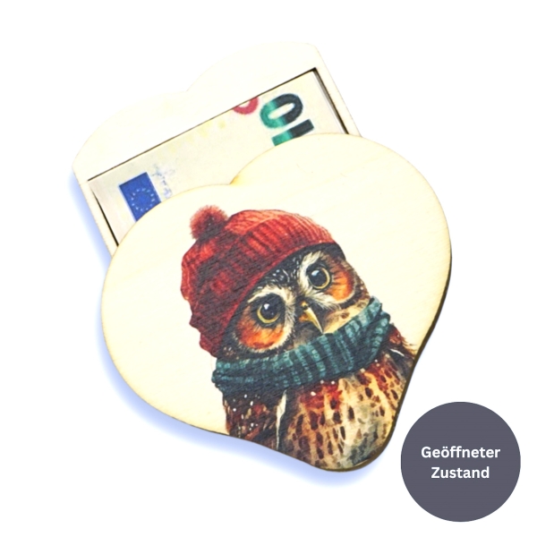 Geldgeschenk Holz - Herz mit Eule Weihnachten bedruckt