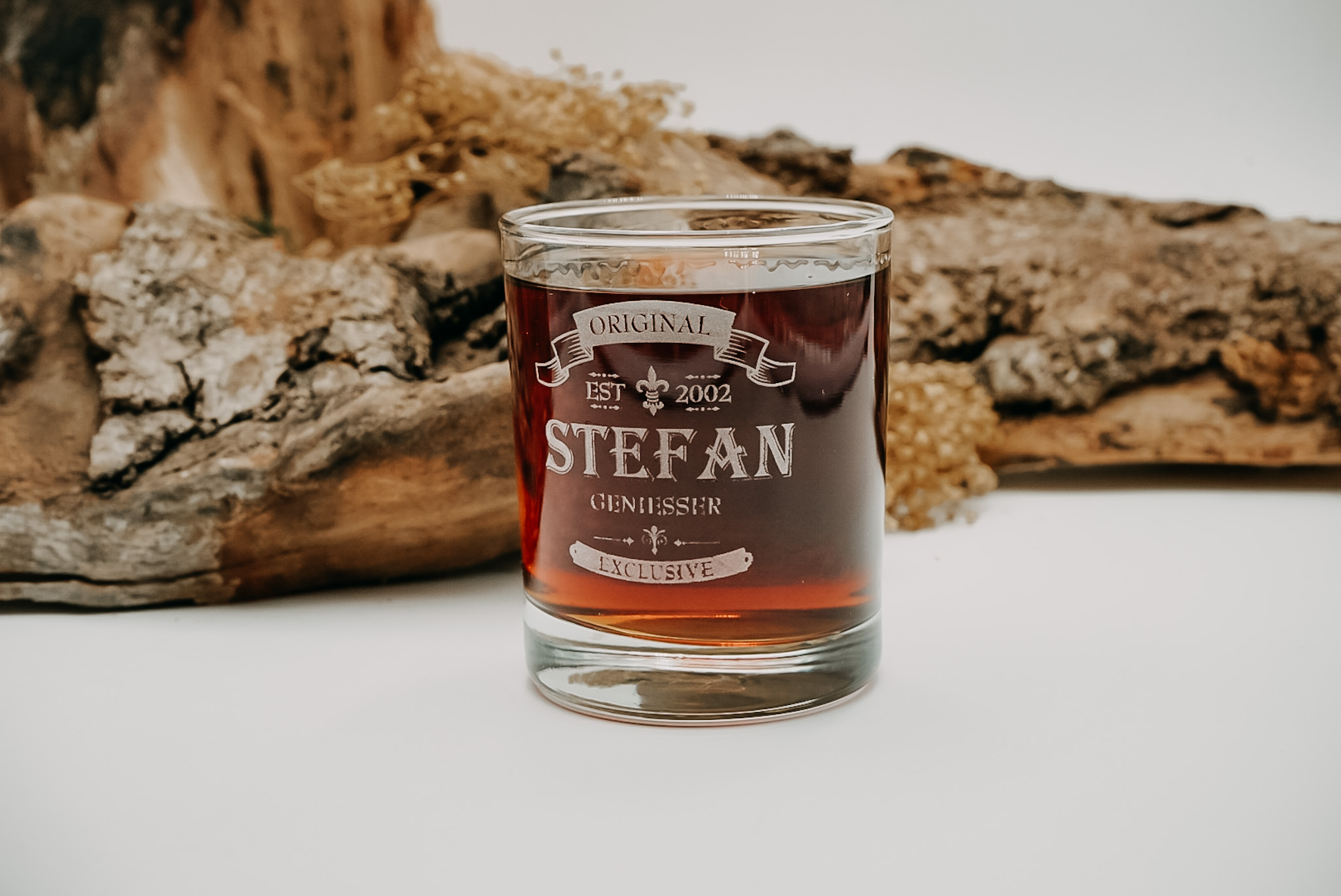 Unser graviertes Glas ist nicht nur ein Whiskyglas – es ist ein Kunstwerk, das Erinnerungen festhält. Das spezielle Design verbindet den Namen der beschenkten Person mit dem Geburtsjahr. Ein einzigartiges Geschenk, das nicht nur den Gaumen erfreut, sondern auch persönliche Geschichten erzählt.