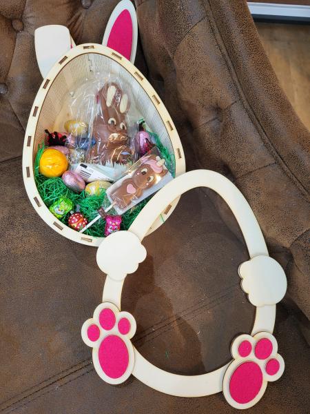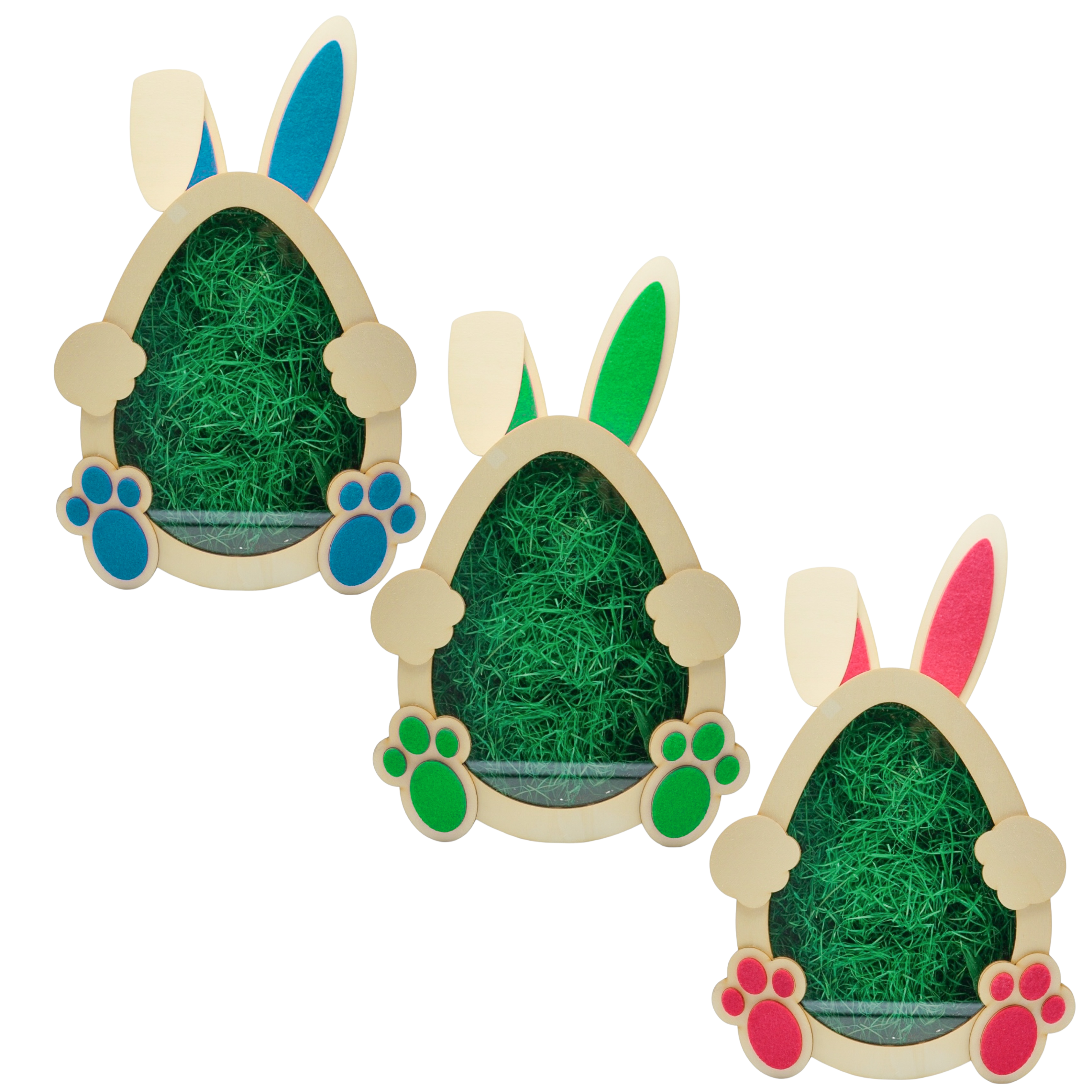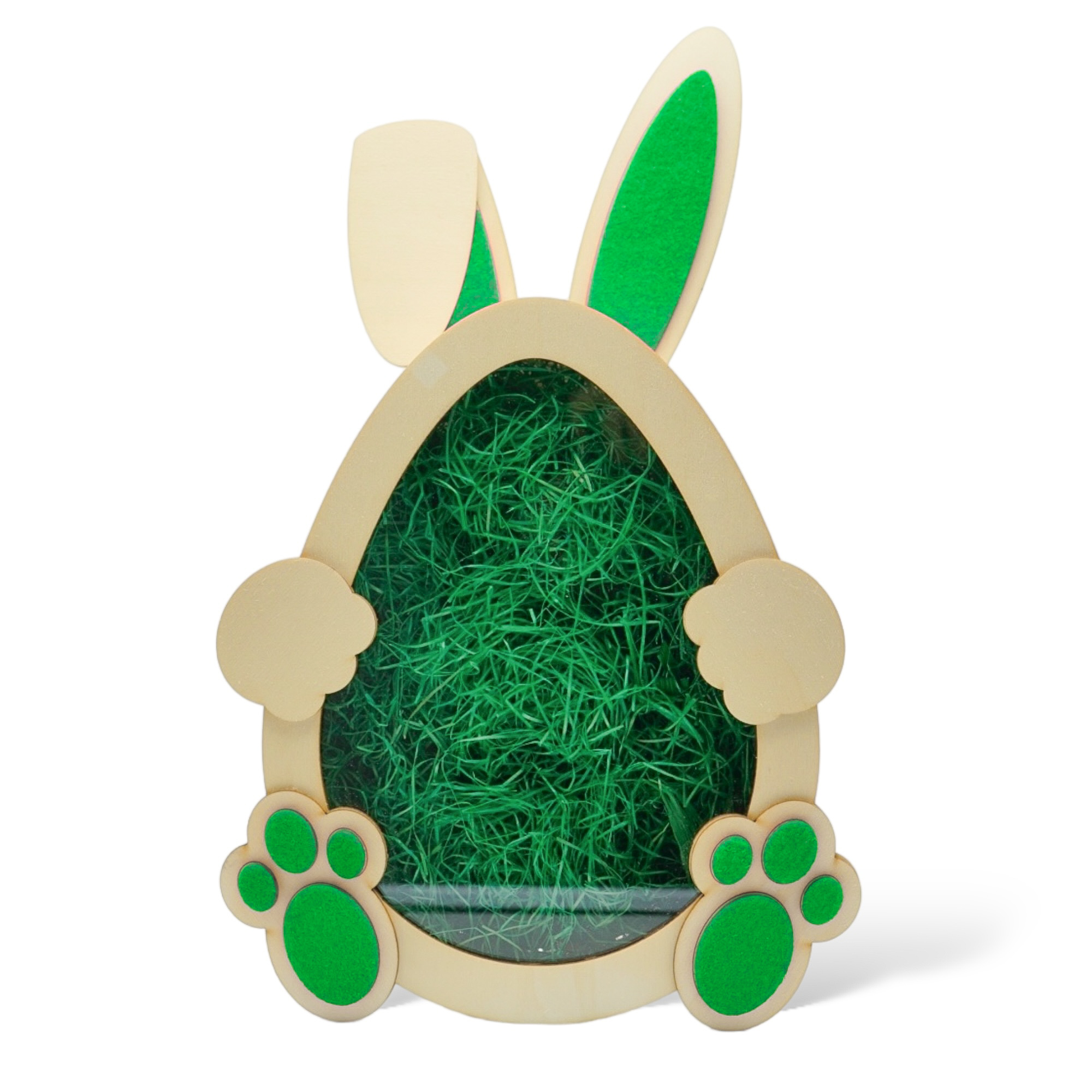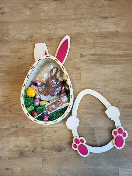 Entdecken Sie unser exklusives Osternest, das mehr als nur eine Holzkiste ist. Das Ei-förmige Design mit einem niedlichen versteckten Hasen, dessen Ohren und Pfoten mit pinkem oder blauem Filz verziert sind, macht dieses Geschenk besonders kinderfreundlich und liebenswert.