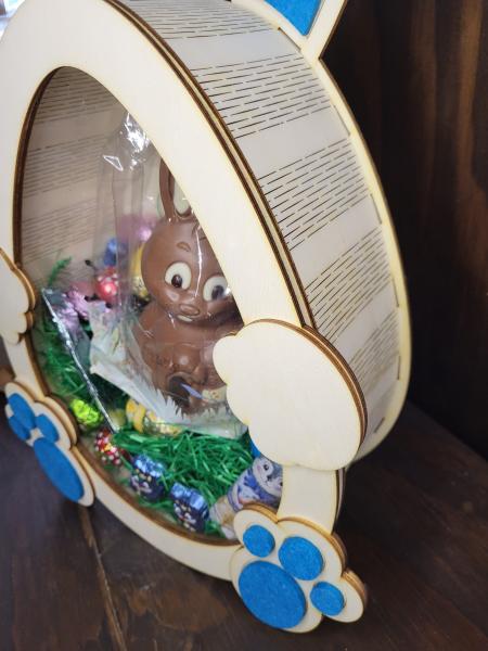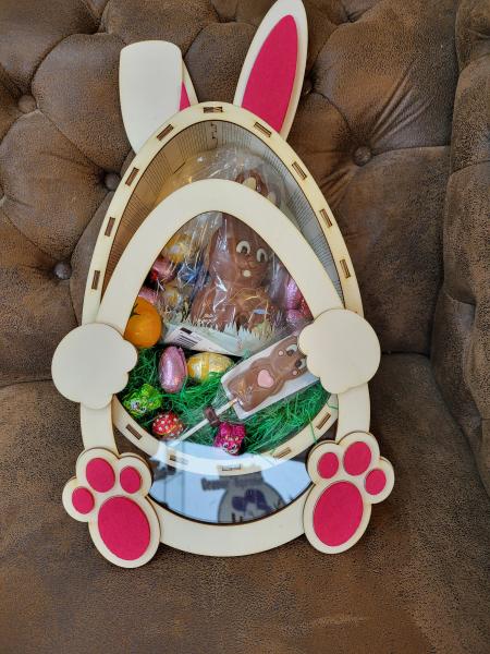 Osternest mit Deckel in Form eines Eies hinter dem sich ein Häschen versteckt. Die Ohren und die Pfoten sind mit pinken oder blauen Filz beklebt, das perfekt für Kinder als Geschenk ist. Wir können natürlich die Kiste auch mit einen Namen oder Spruch personalisieren, das wir dann auf dem Plexiglas platzieren.