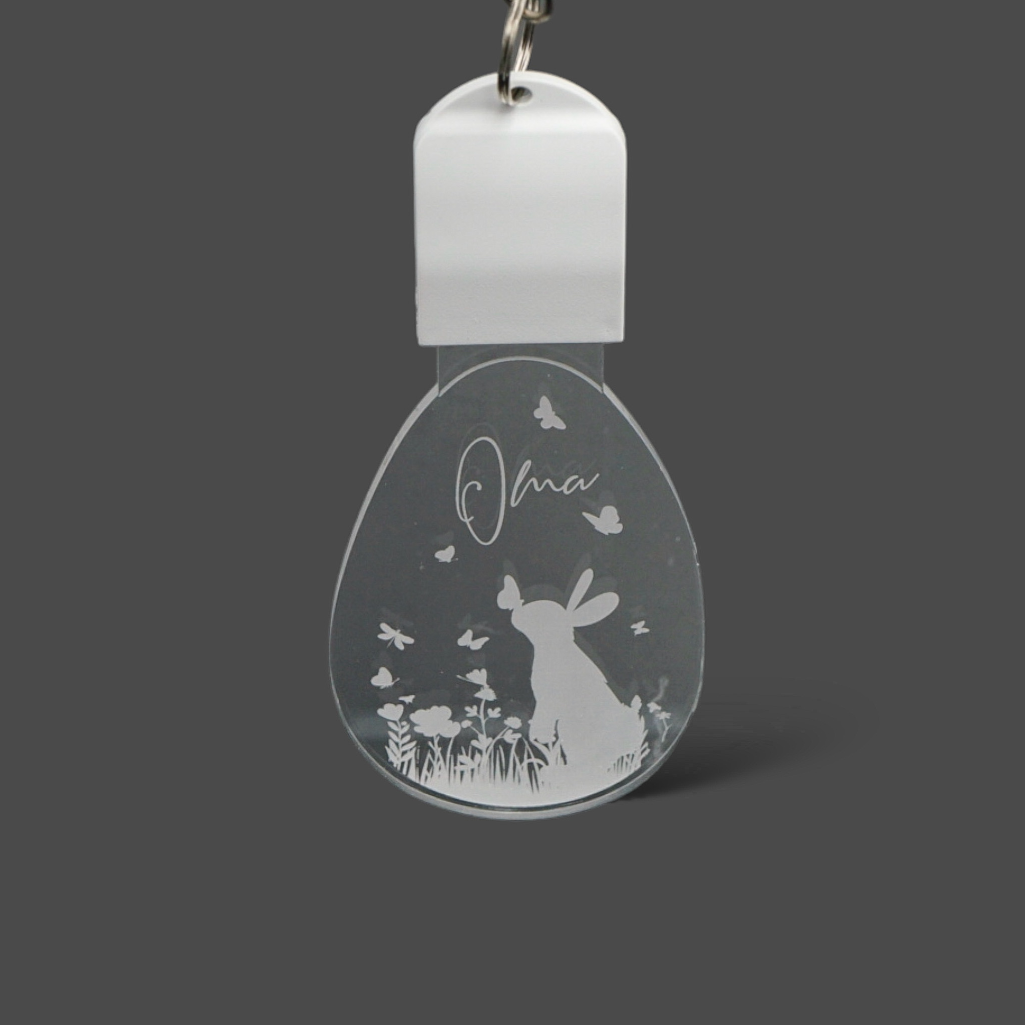 Machen Sie Schlüsseltragen zu einem Fest: Unser LED-Schlüsselanhänger mit einem bezaubernden Osterei aus Acrylglas, verziert mit einem niedlichen Hasen und einem Schmetterling auf der Nase, wird nicht nur zum praktischen Begleiter, sondern auch zum individuellen Blickfang. Das LED Licht des Anhängers kann die Farbe wechseln und wird mit einem praktischen Ladekabel geliefert. Zusätzlich wird der Schlüsselanhänger durch die Gravur Ihres Namens zu einem persönlichen Accessoire.